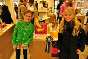 Drie scholen uit het centrum van Hengelo deden mee: de Willemschool, de Kardinaal Alfrink school en De Wingerd. Bij elkaar hadden 54 leerlingen uit de groepen 6 meegedaan en in koppels van twee waren er 27 maquettes in elkaar gezet. Ze hadden daarvoor een bouwplaat van het pand aan de Markt gekregen om daar bovenop een zo mooi, maar vooral zo fantasierijk mogelijk opbouwtje te maken. De winnaressen, afkomstig van de Willemschool hadden flink uitgepakt en dat was de deskundige jury niet ontgaan. Er zat van alles in: van terras tot sauna, van luxe badkamer tot open haard. Juliëtte verklapte na afloop dat zij geen hulp hadden gehad maar dat er wel ‘een soort oom’ was geweest die architect is en die had gezegd dat ze vooral iets geks en bijzonders moesten maken. Nou dat was gelukt en met succes. De dames waren zeer in hun nopjes met de prijs waarop ze hun idolen zullen gaan beluisteren. Dat waren toch vooral Kate Perry eb Adele! Of ze later ook architect gaan worden? ‘Nou.... misschien.’ Voorlopig wilden ze allebei vooral juf worden.